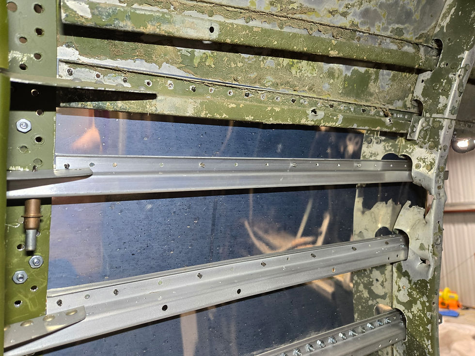 An original stringer, with crash damage and bulletholes, is removed and replaced.